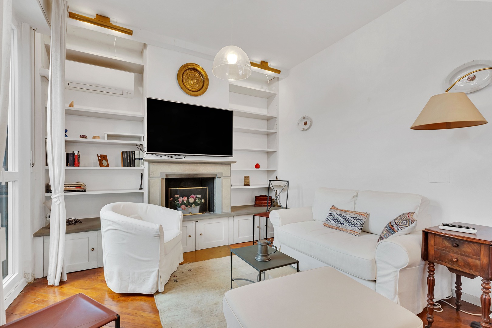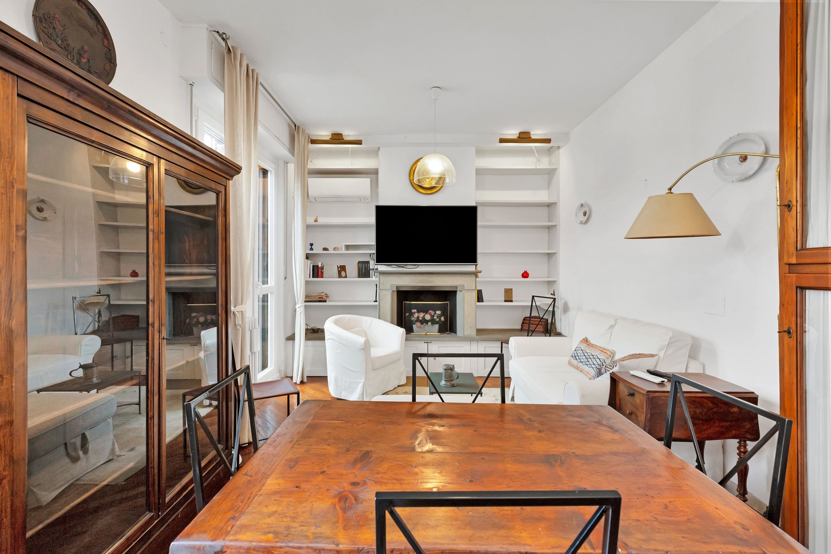 L’ingresso si apre sul soggiorno ampio e invitante, dove l’arredo, un’armoniosa fusione di moderno e antico, si sposa perfettamente con un’atmosfera di raffinata praticità con mobilio su misura e armadiature a scomparsa, anche per contenere stampante, computer e quanto necessario per un agevole lavoro da remoto. Questo è anche il luogo ideale dove trascorrere serate rilassanti davanti al camino di design, incastonato nella libreria, e dove guardare il proprio film preferito sul grande schermo televisivo che, dal centro della parete, offre la visione perfetta da ogni angolo della sala.