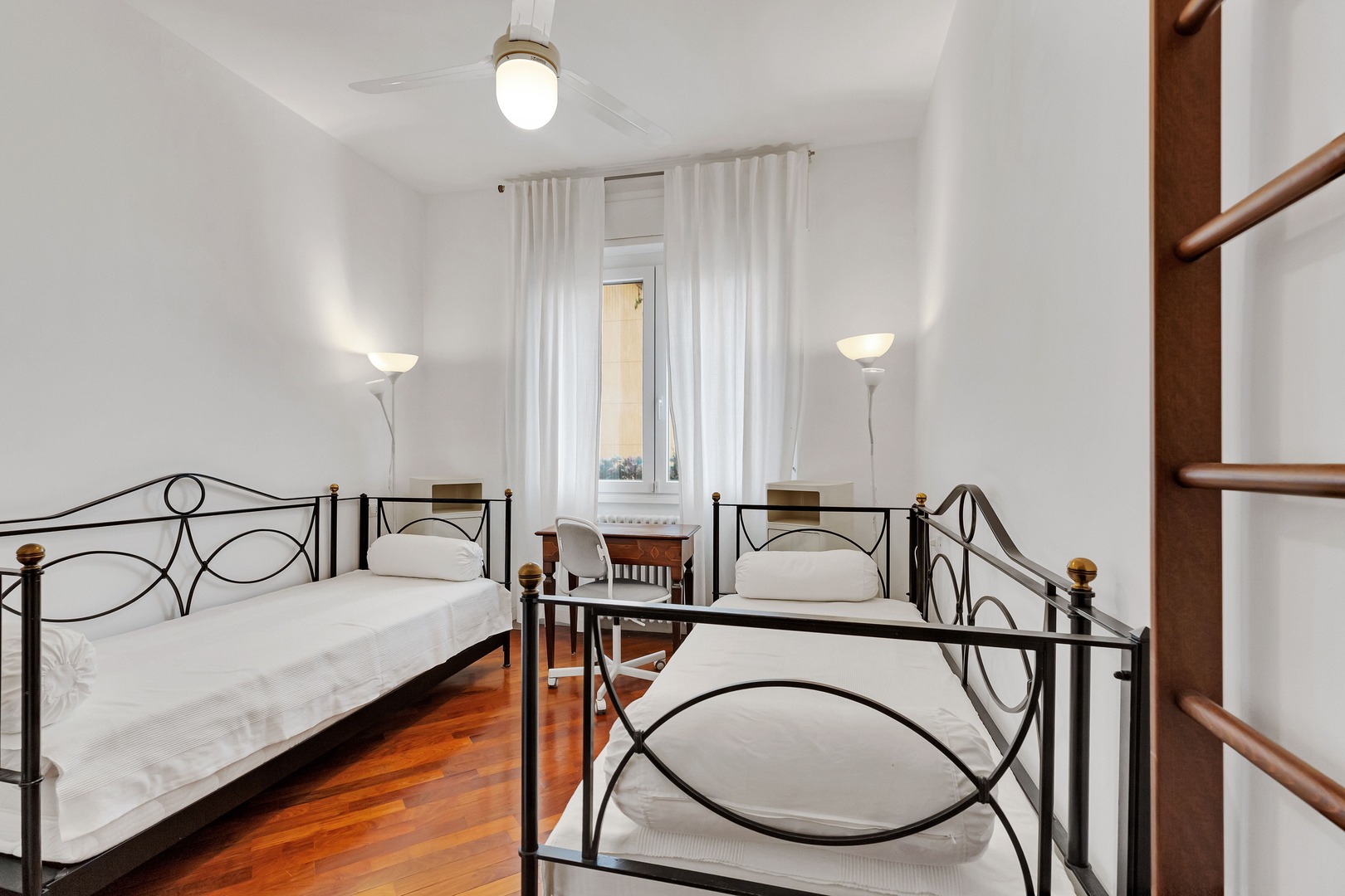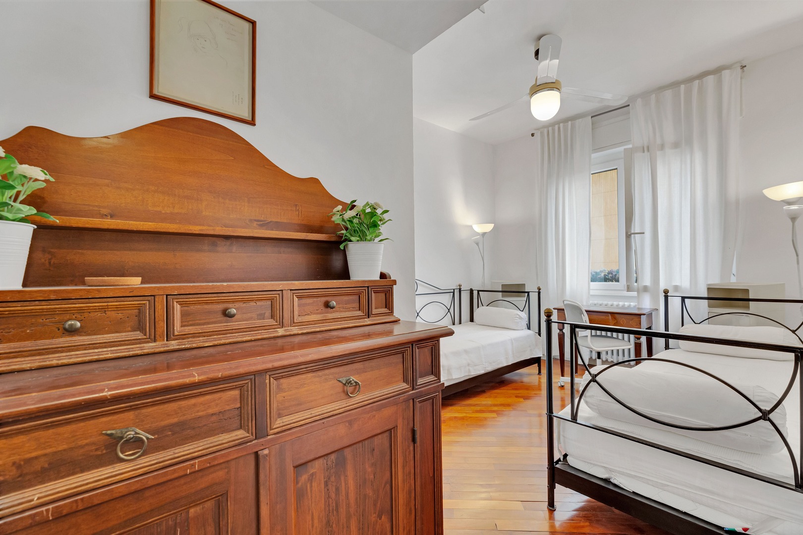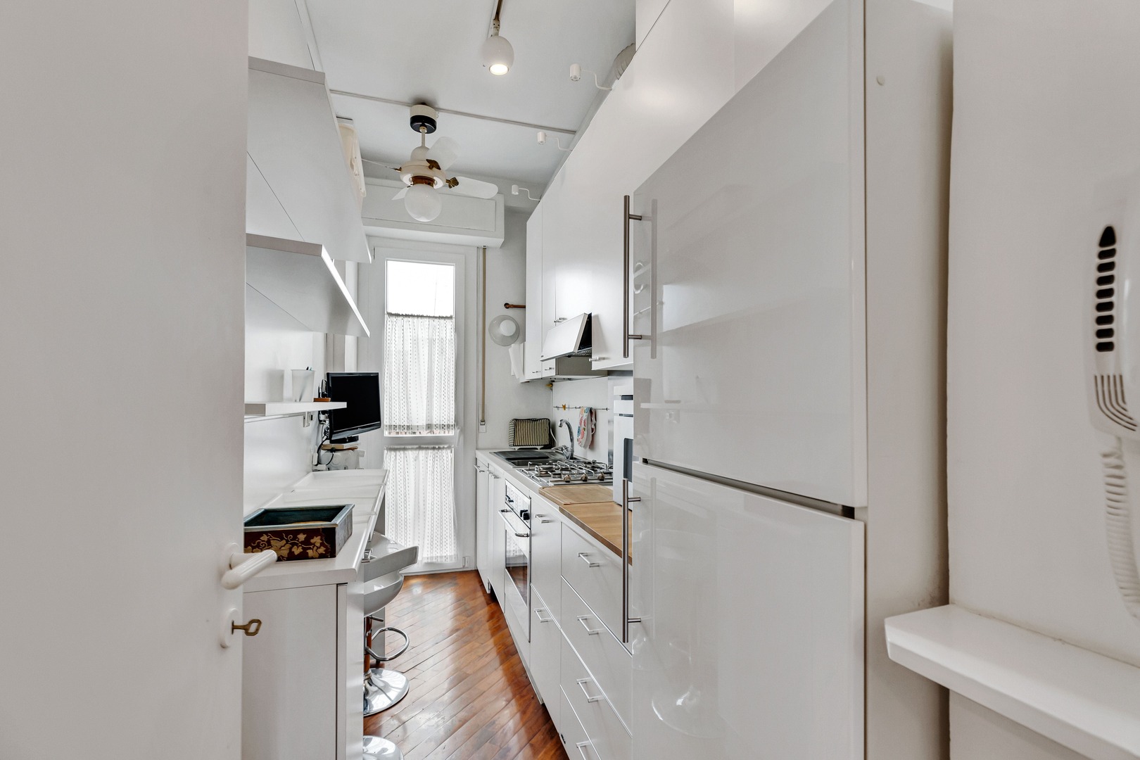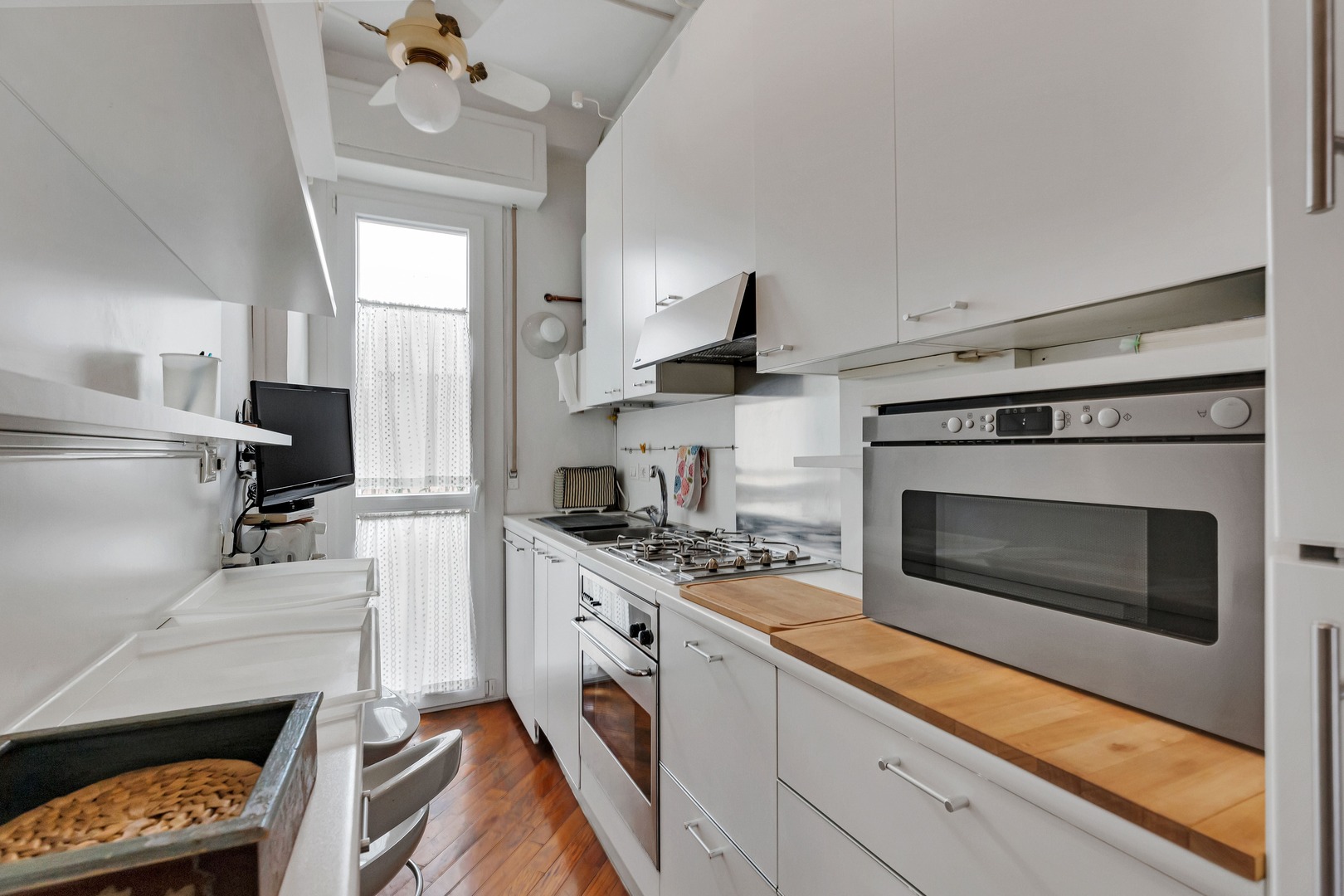 La cucina abitabile, completamente attrezzata, è dotata di lavastoviglie e di ogni elettrodomestico, compreso la seconda tv con braccio snodabile, ha il suo balconcino con vista sul cortile interno. La camera da letto matrimoniale o con doppio letto singolo, un vero e proprio santuario di pace, è valorizzata da una spaziosa cabina armadio, mentre il bagno, finestrato e completo di lavasciuga, offre uno spazio di puro comfort.